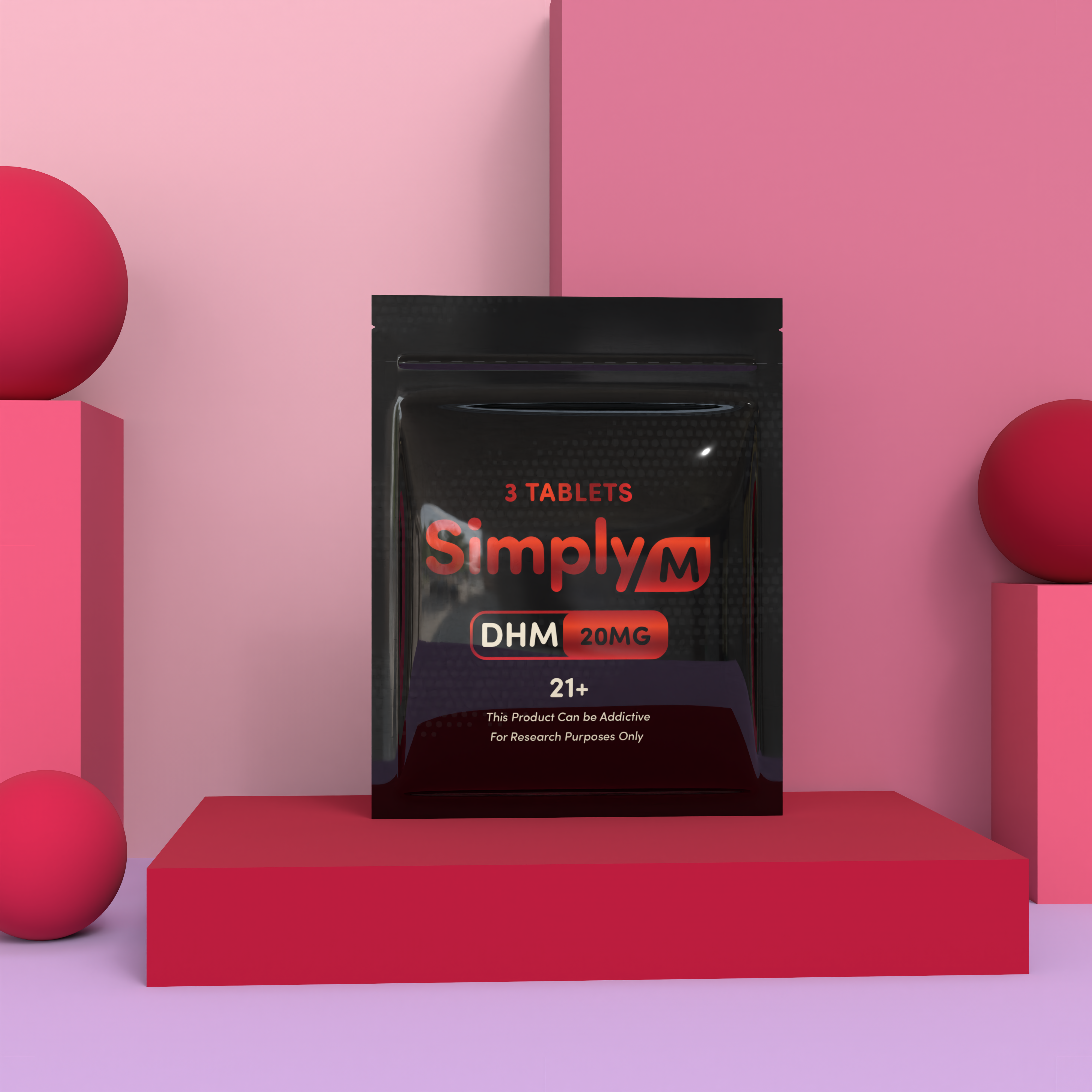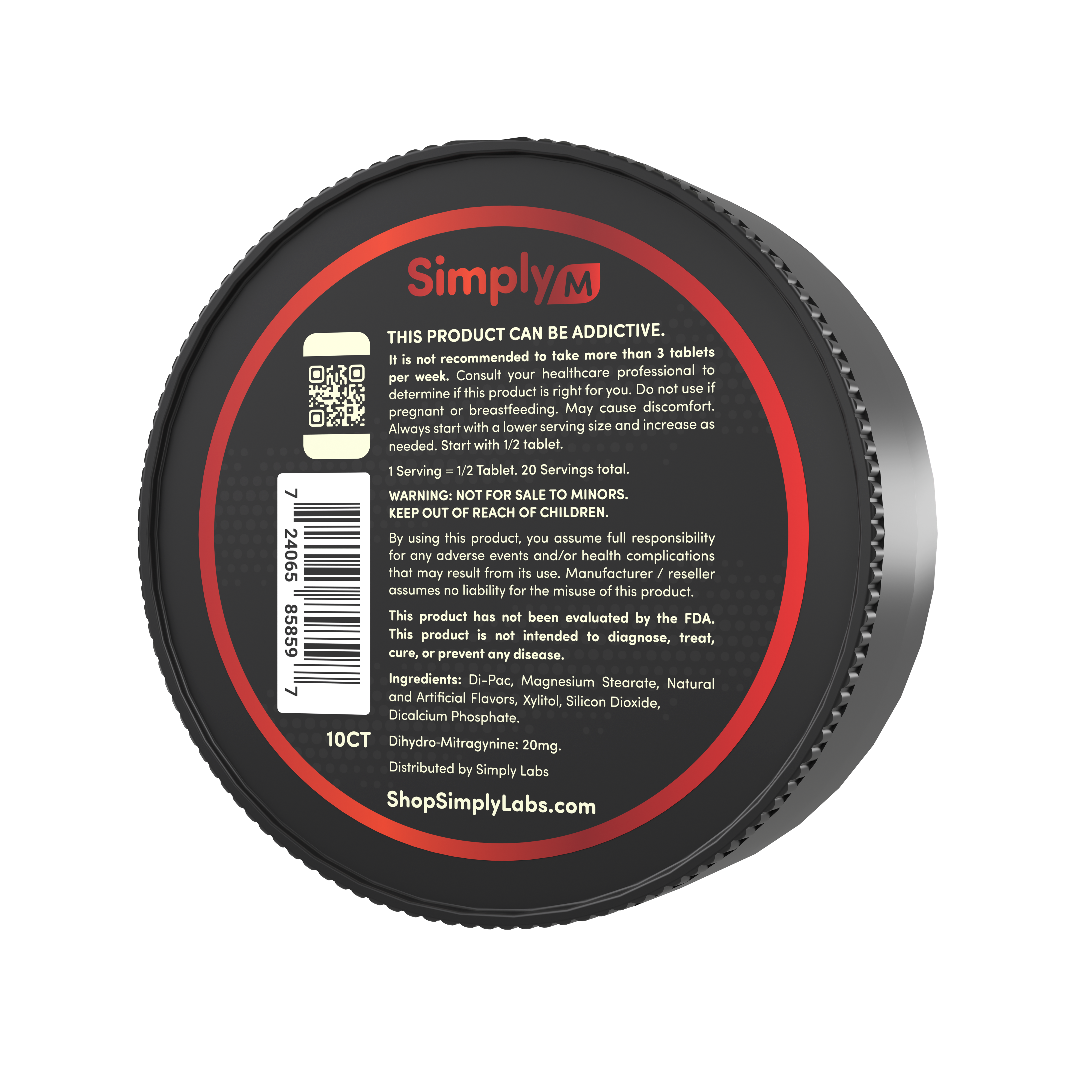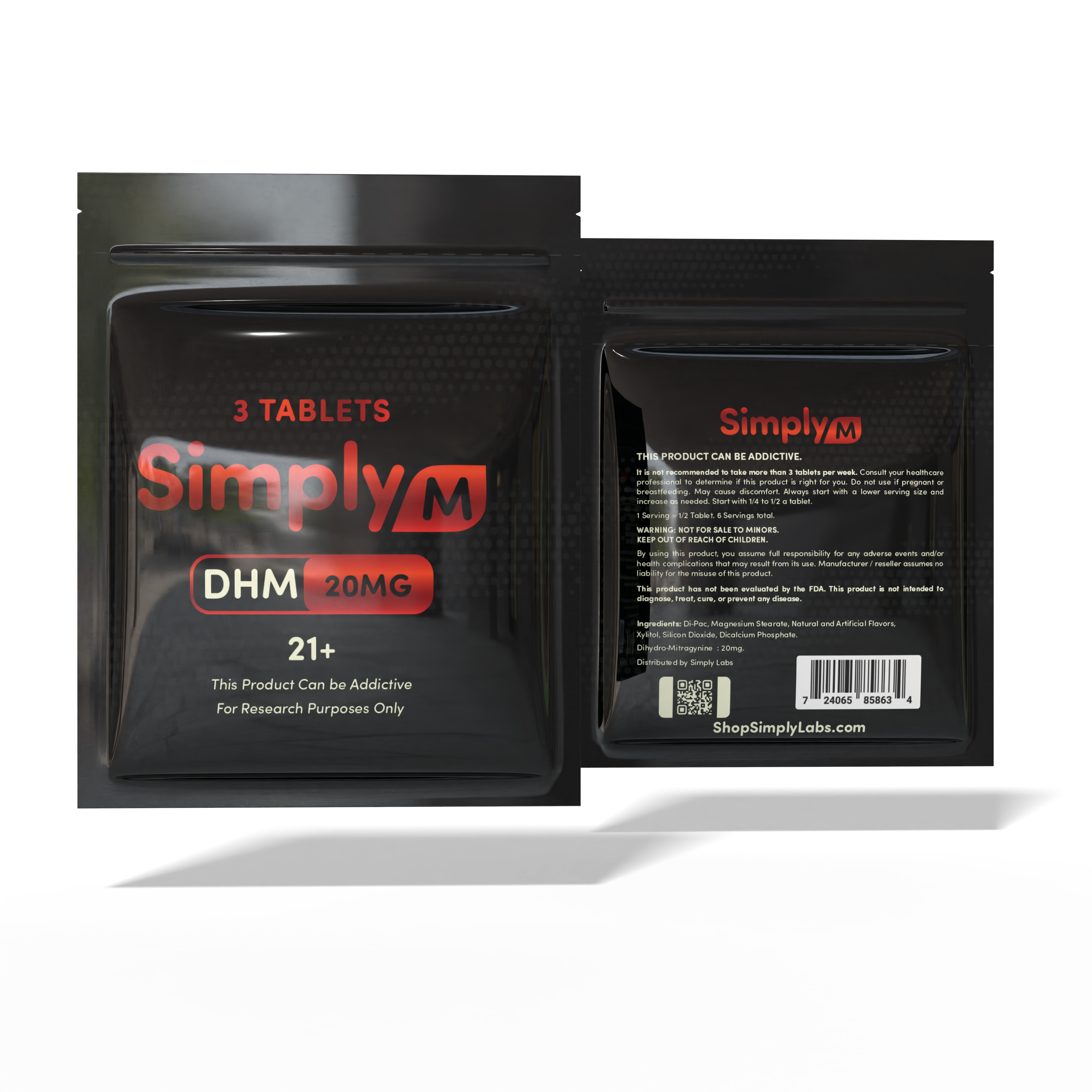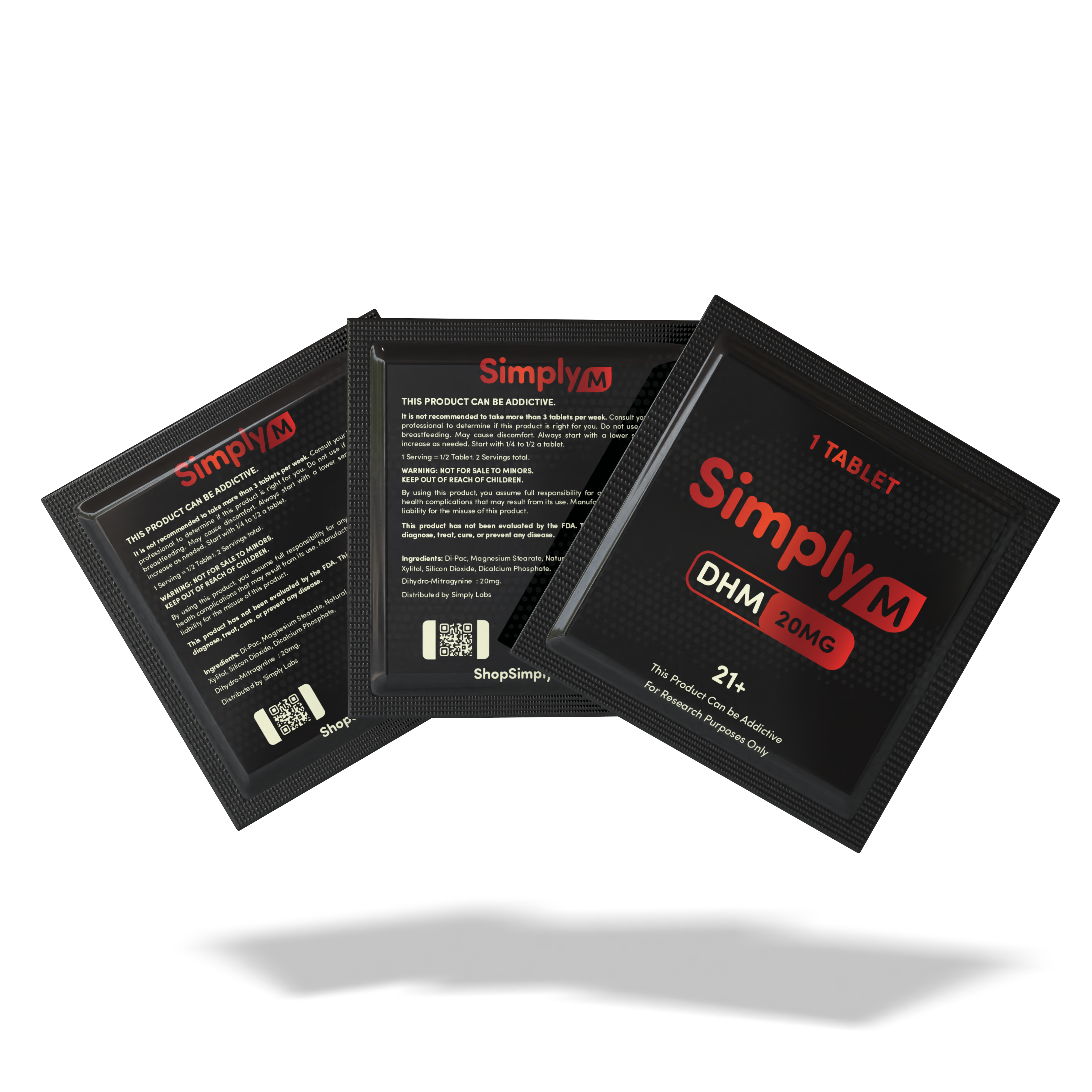 Each tablet contains 20mg of DHM (dihydro mitragynine) and comes in single packs, 3-count pouches, and 10-count pucks. Simply M contains zero 7-OH and no banned substances, making it fully legal anywhere kratom is allowed.